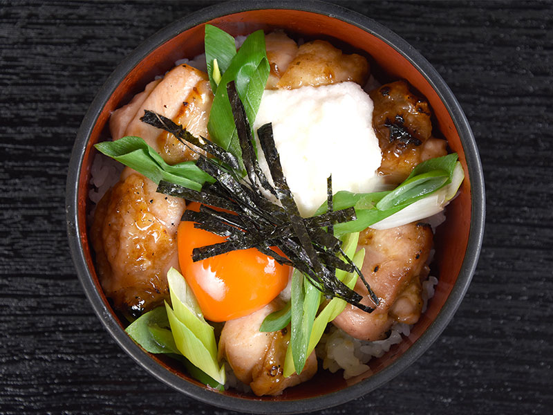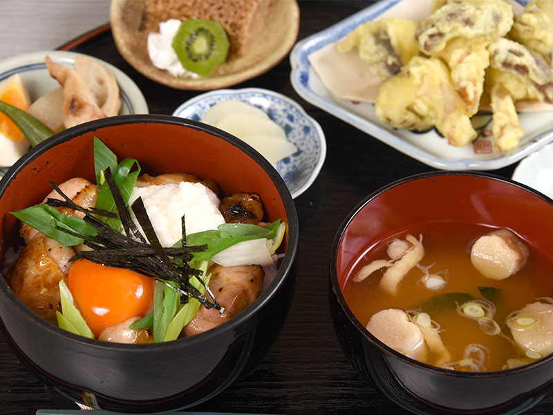 香ばしく柔らかい鶏肉、カケタ養鶏場の濃厚な卵、強いねばりで滑らかな金精のとろろ、甘じょっぱいタレの染み込んだごはん…全てが互いを引き立てる丼ぶりです。金ケ崎町産のしいたけの天ぷらは、厚みがありジューシー。ぜひ、伝統的建造物群保存地区の侍住宅で、趣ある雪景色と共にお食事をお楽しみください。